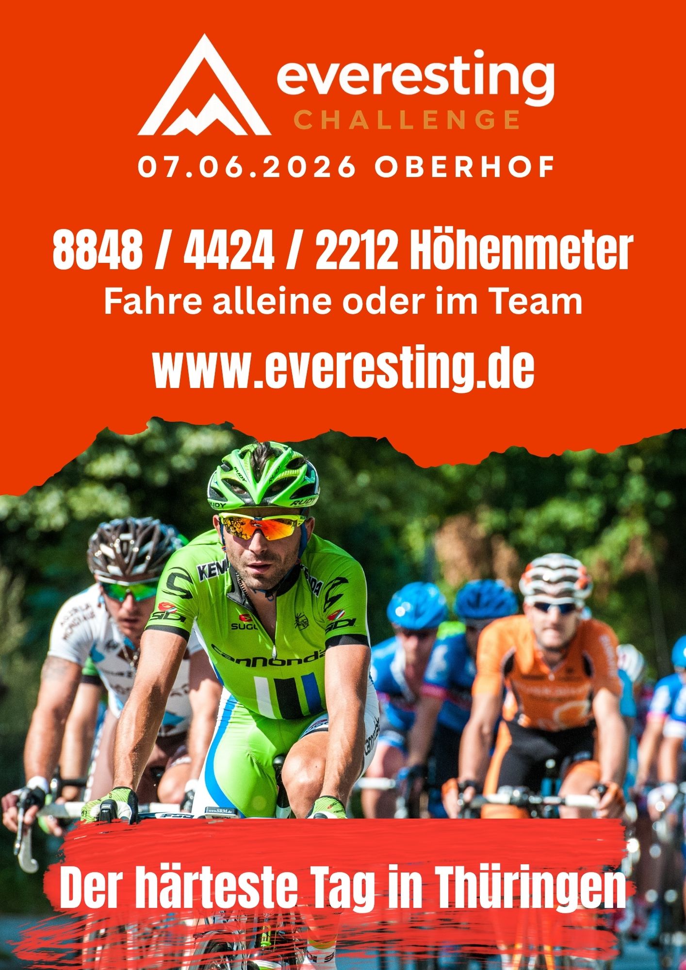 Save the date: Am 07.06.2026 findet in Oberhof/Thüringen das Everesting Festival statt. Neben der Königsdisziplin, den 8848 Höhenmetern, wird es auch ein Half Everesting und ein Quarter Everesting geben. Diese können als Einzelstarter oder Staffel absolviert werden. Details zum Event findet ihr hier.